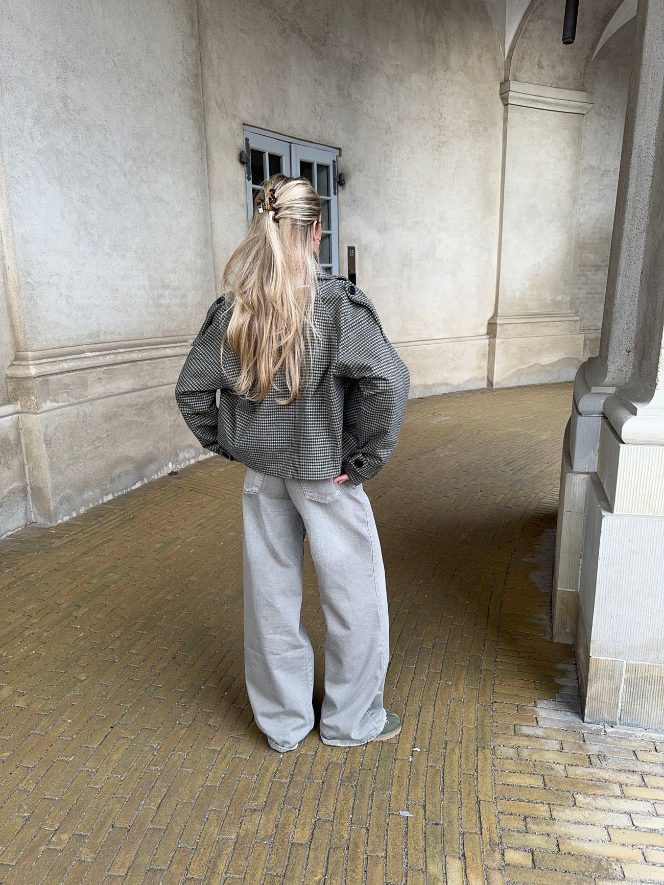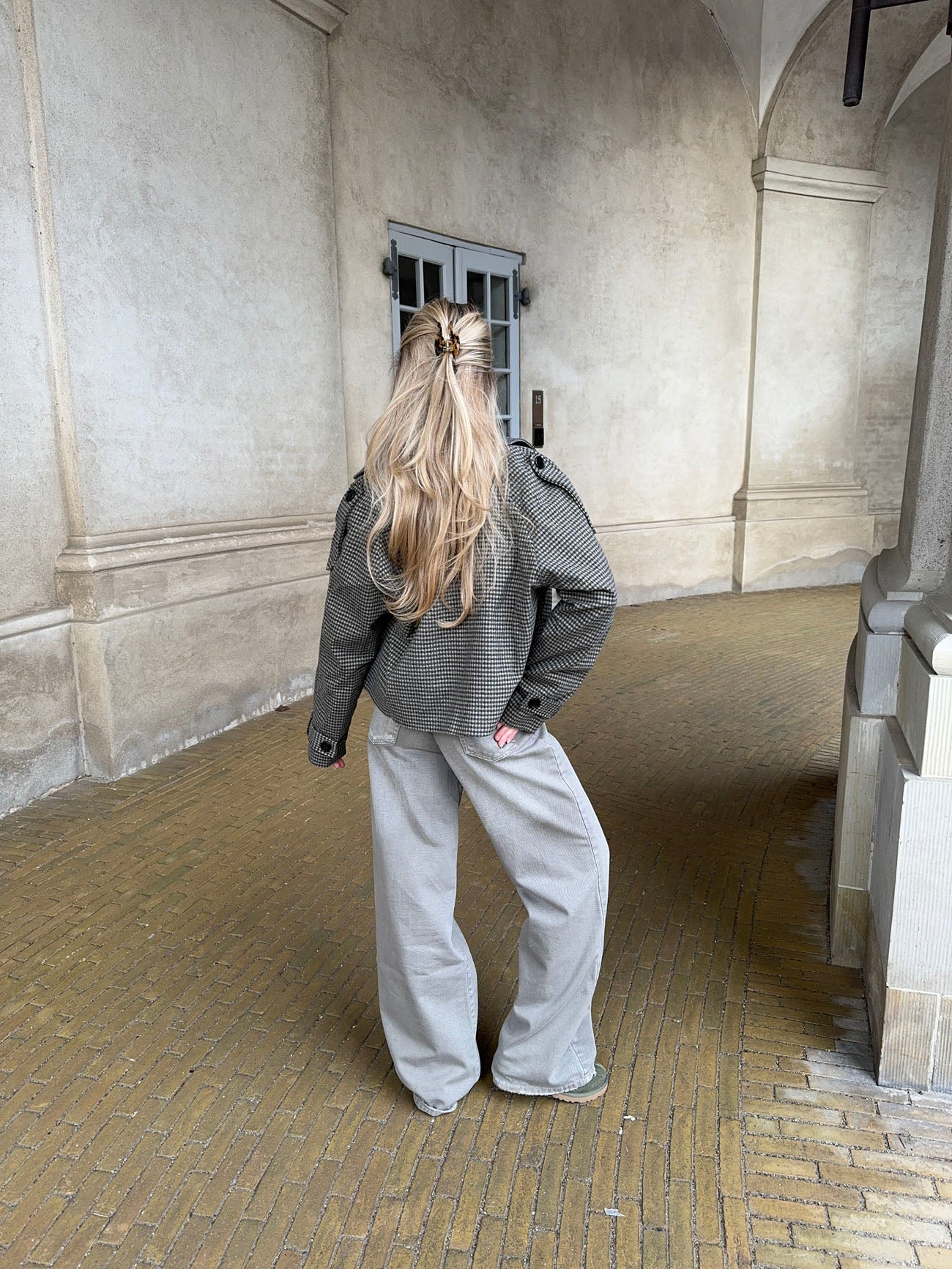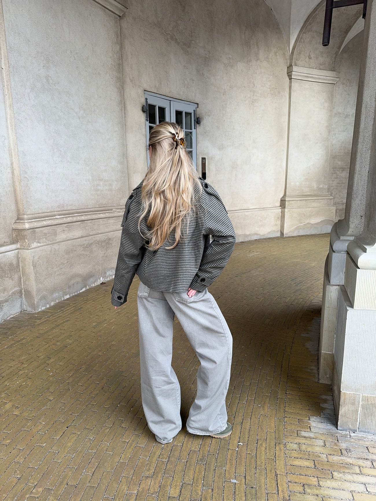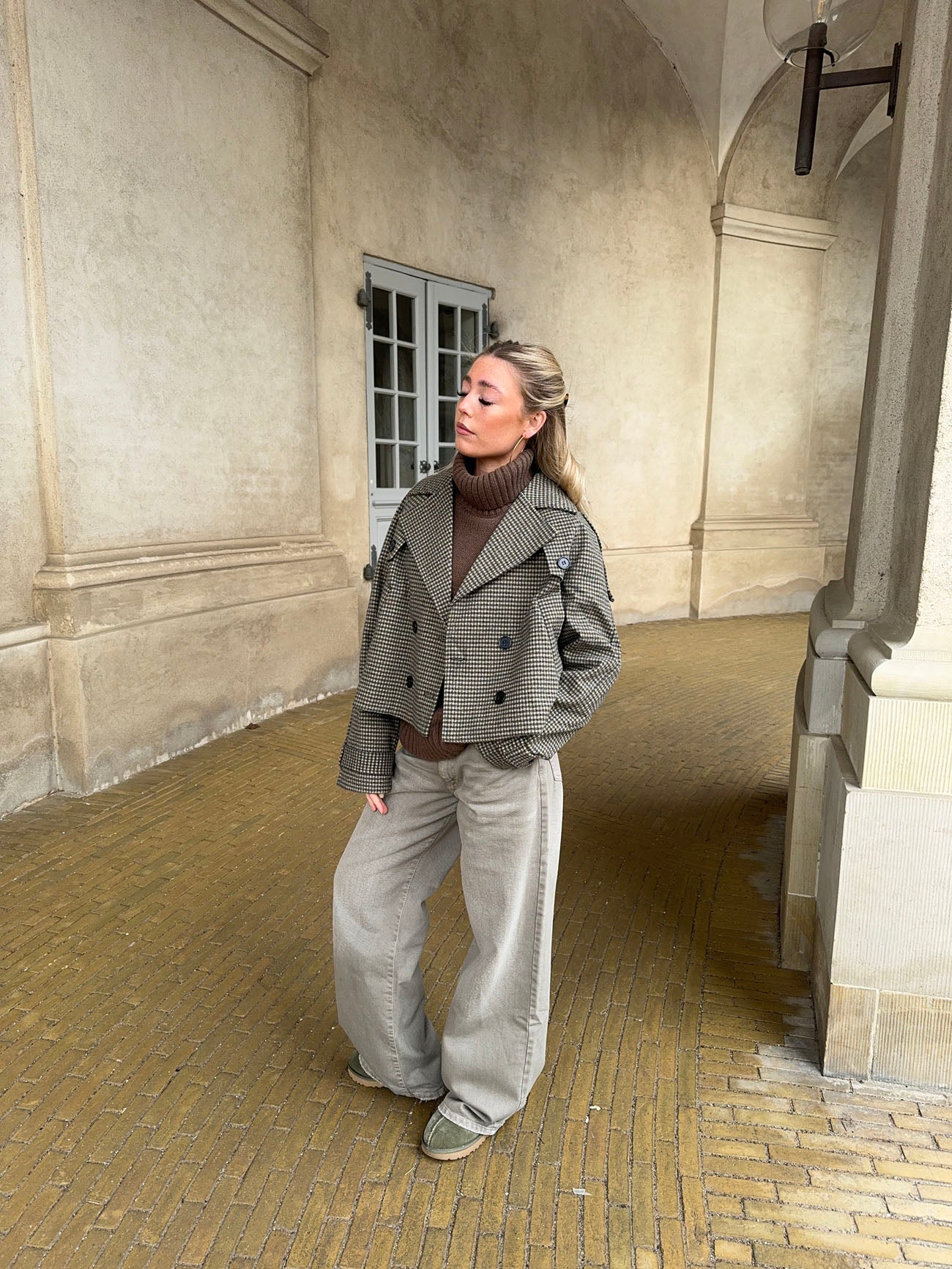 This short coat is an elegant choice with a classic collar and button closure, creating a timeless look. The checkered pattern gives the coat a sophisticated and eye-catching design, while the subtle details on the shoulders and cuffs add a modern edge. Practical pockets enhance both functionality and style. Perfect for completing a professional and sleek autumn or winter outfit.