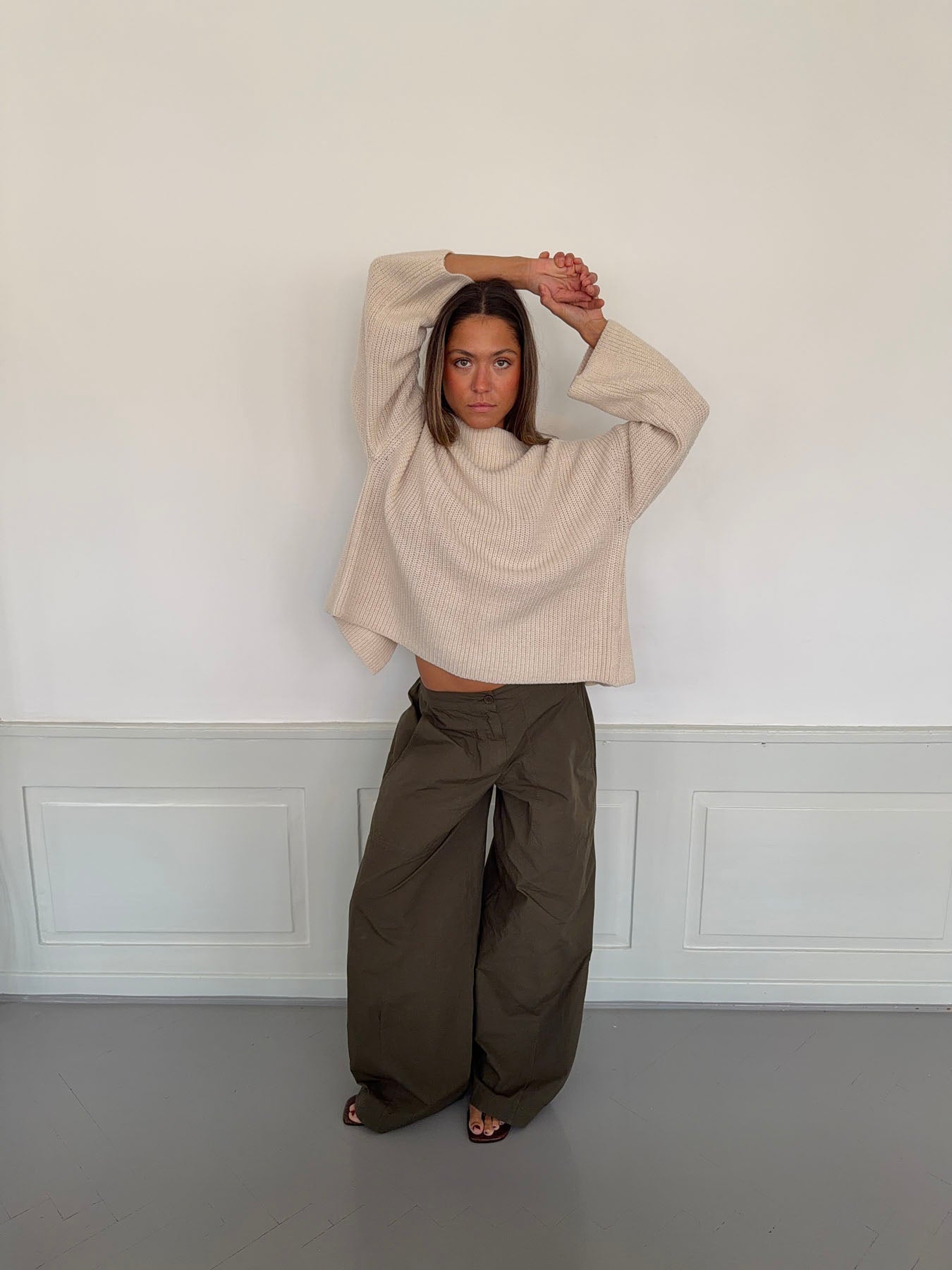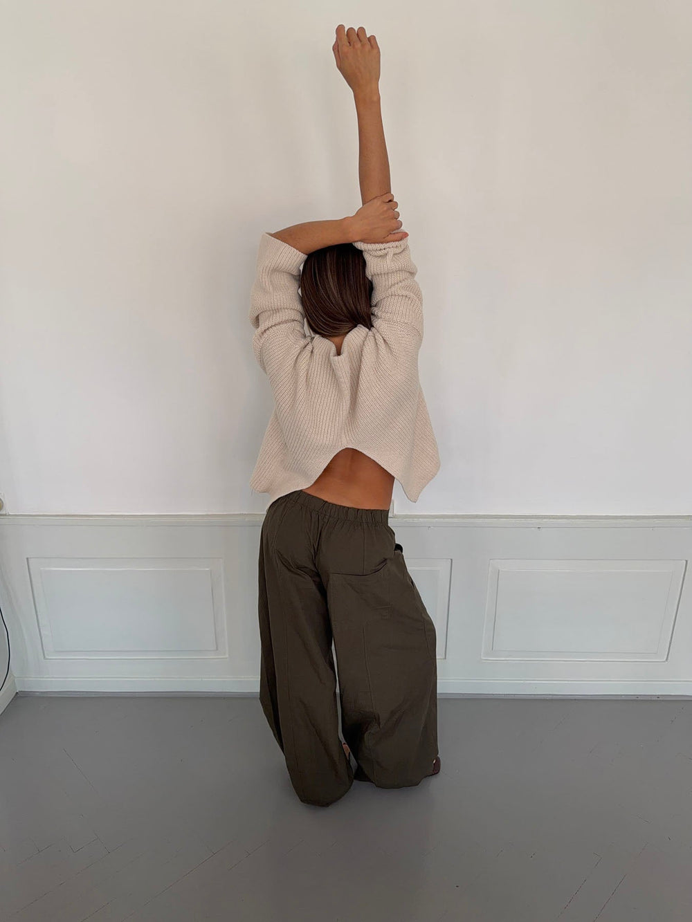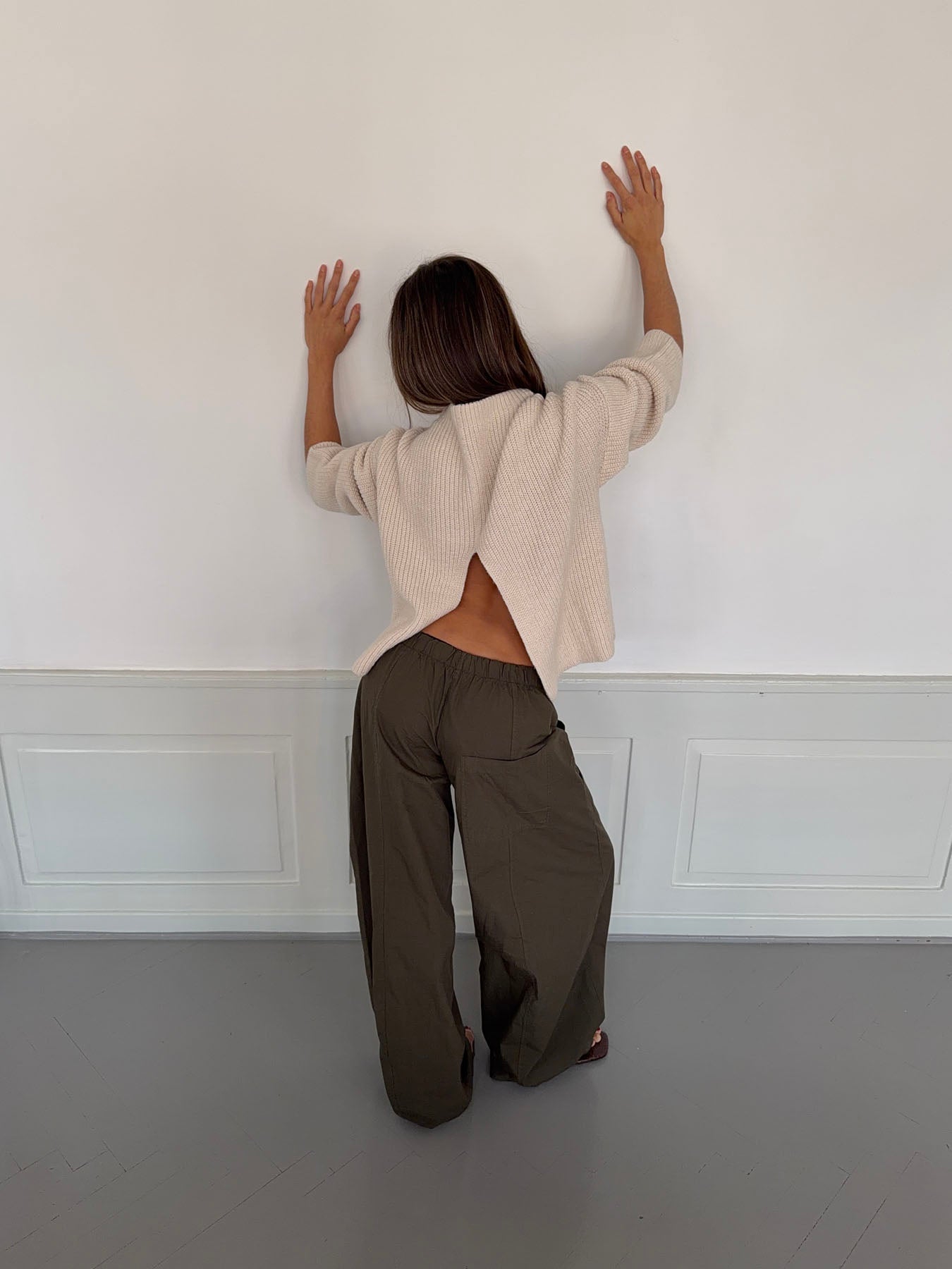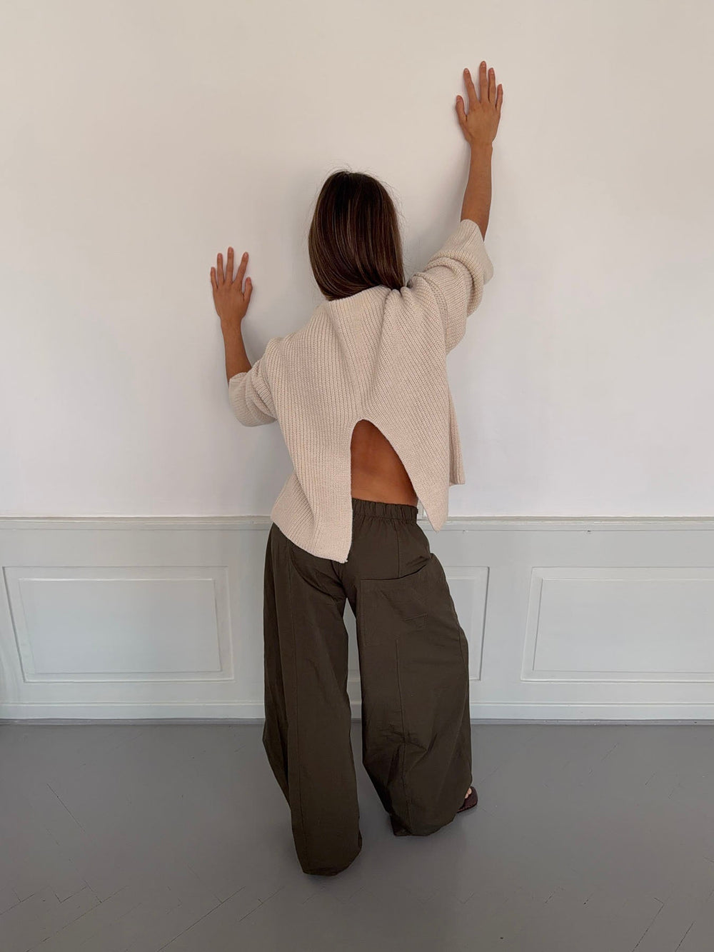 This sand-colored knit blouse combines cozy comfort with a modern twist. The soft ribbed knit gives it a relaxed yet refined feel, while the half-cut open back design adds a feminine and trendy touch. The fit is slightly boxy with wide sleeves and an elegant high neckline, perfectly balancing the open-back look.