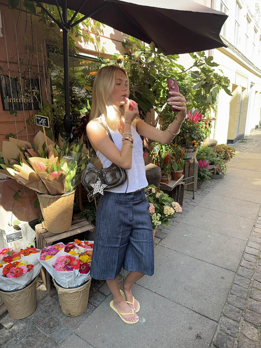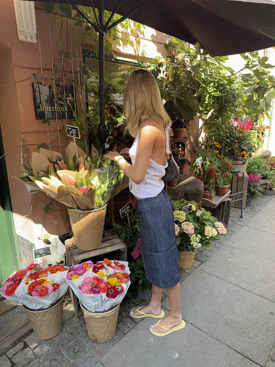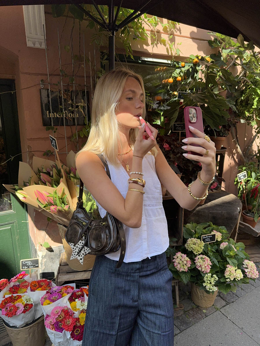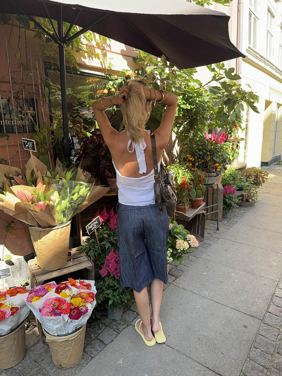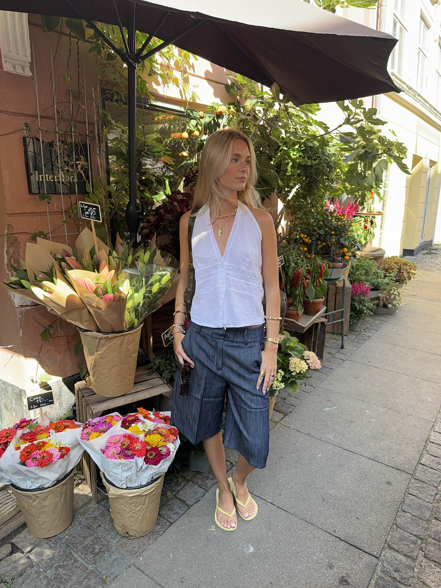 The white halterneck top is the ultimate combination of romantic and light summer style. It is designed with a deep v-neckline, delicate lace details and buttons at the front, which give a feminine and delicate look. It ties at the neck, highlighting the shoulders and creating an open and elegant back. The light fabric makes it ideal for warm days, where you want to feel both relaxed and stylish. Style it with a pair of high-waisted trousers or a breezy skirt for an effortlessly chic look.