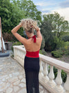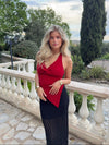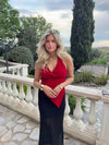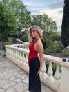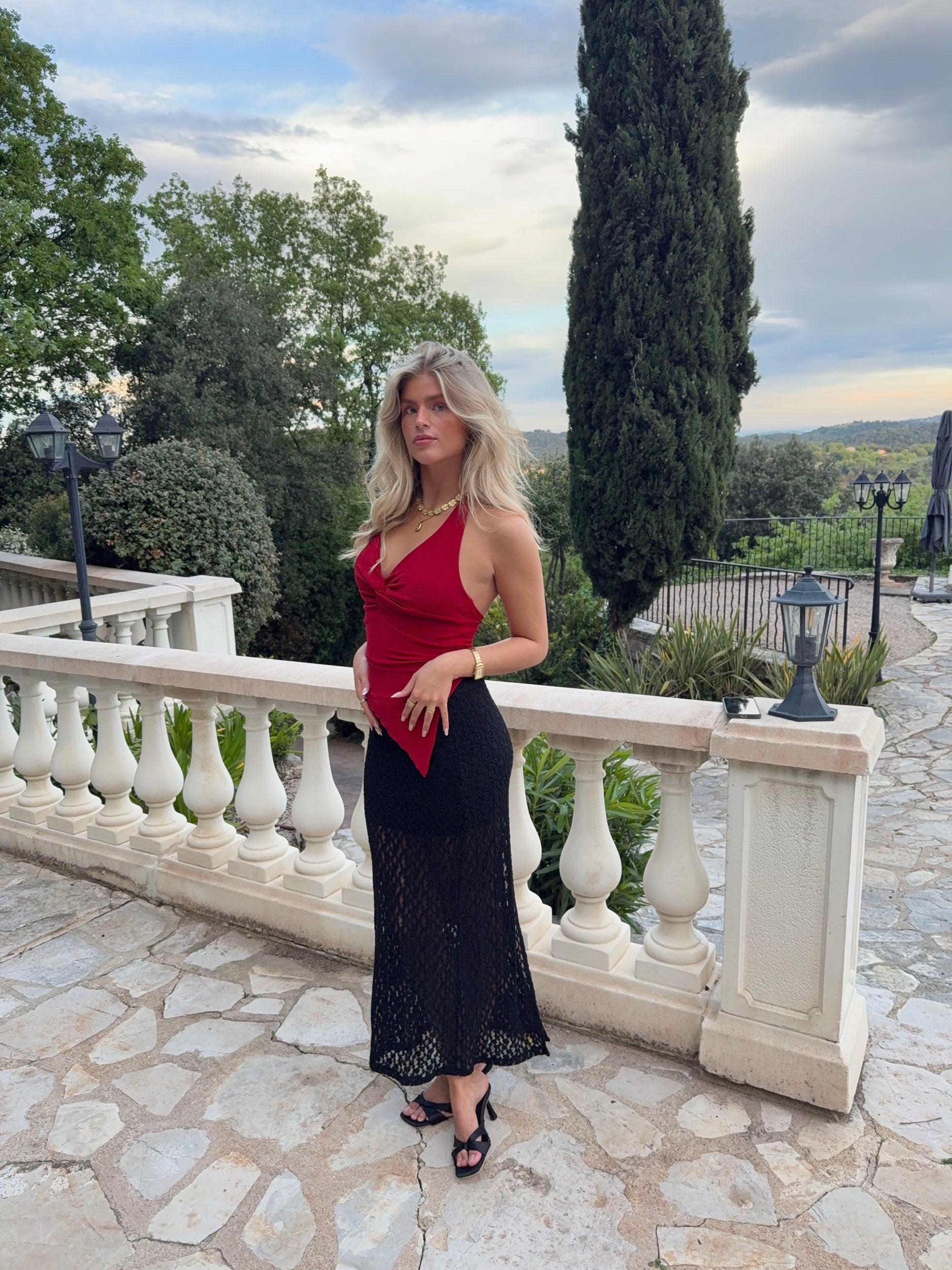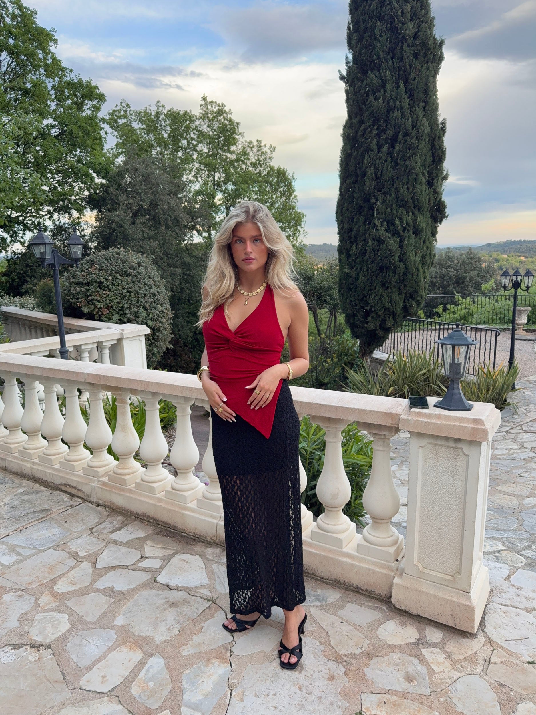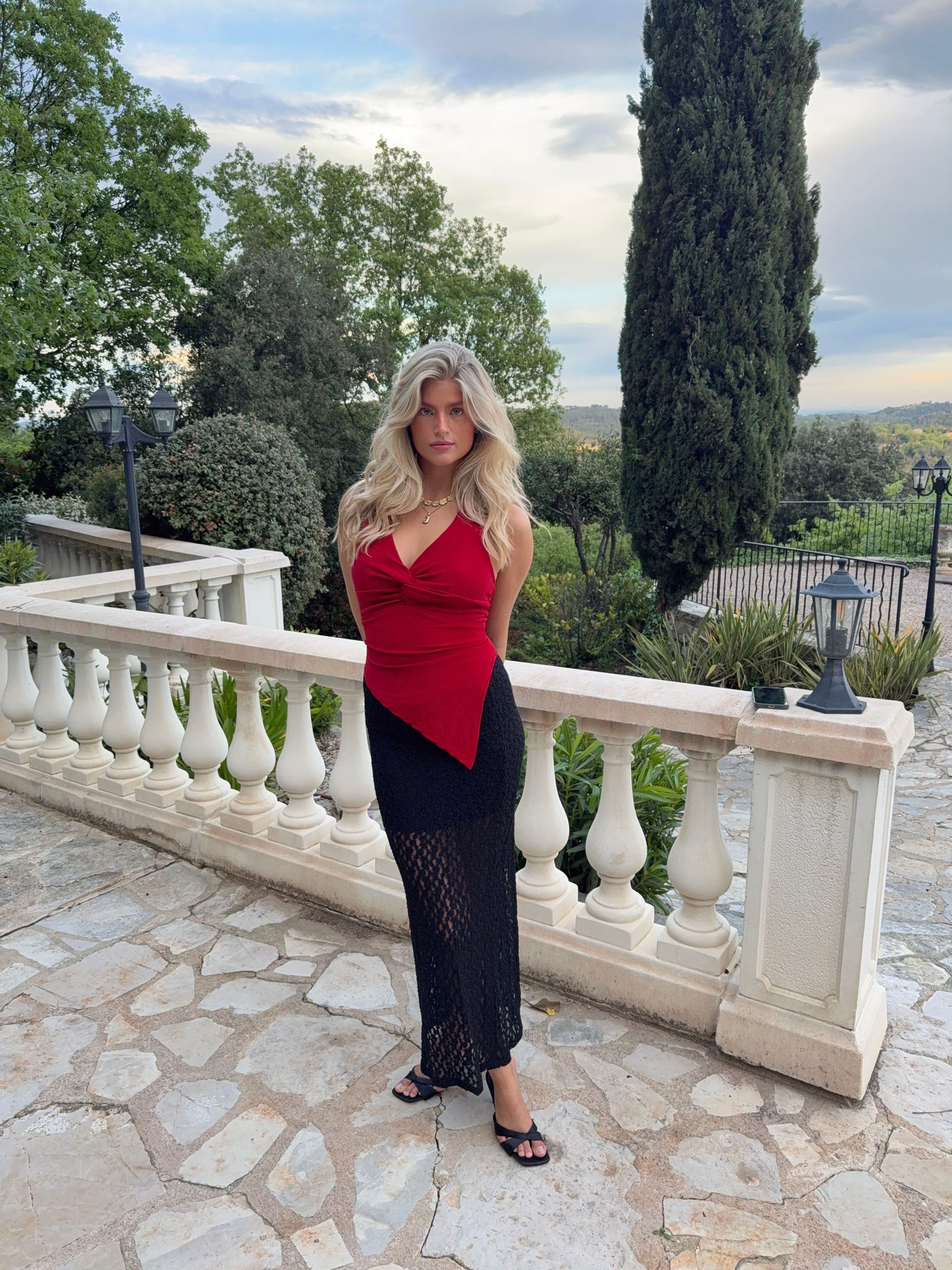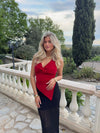 This beautiful red top combines a feminine silhouette with an edgy touch. It ties elegantly at the neck and drapes in an asymmetrical cut that creates a modern and flattering look. Perfect for an evening out or a stylish everyday outfit – pair it with your favorite trousers or jeans.