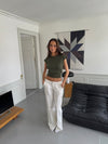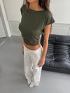 This blouse is an elegant short-sleeved top in a sage green color. It features a loose, gently draping fit with a ribbed elastic band at the bottom, offering a neat and fitted finish at the waist. The round neckline is completed with a simple seam for a minimalist look.