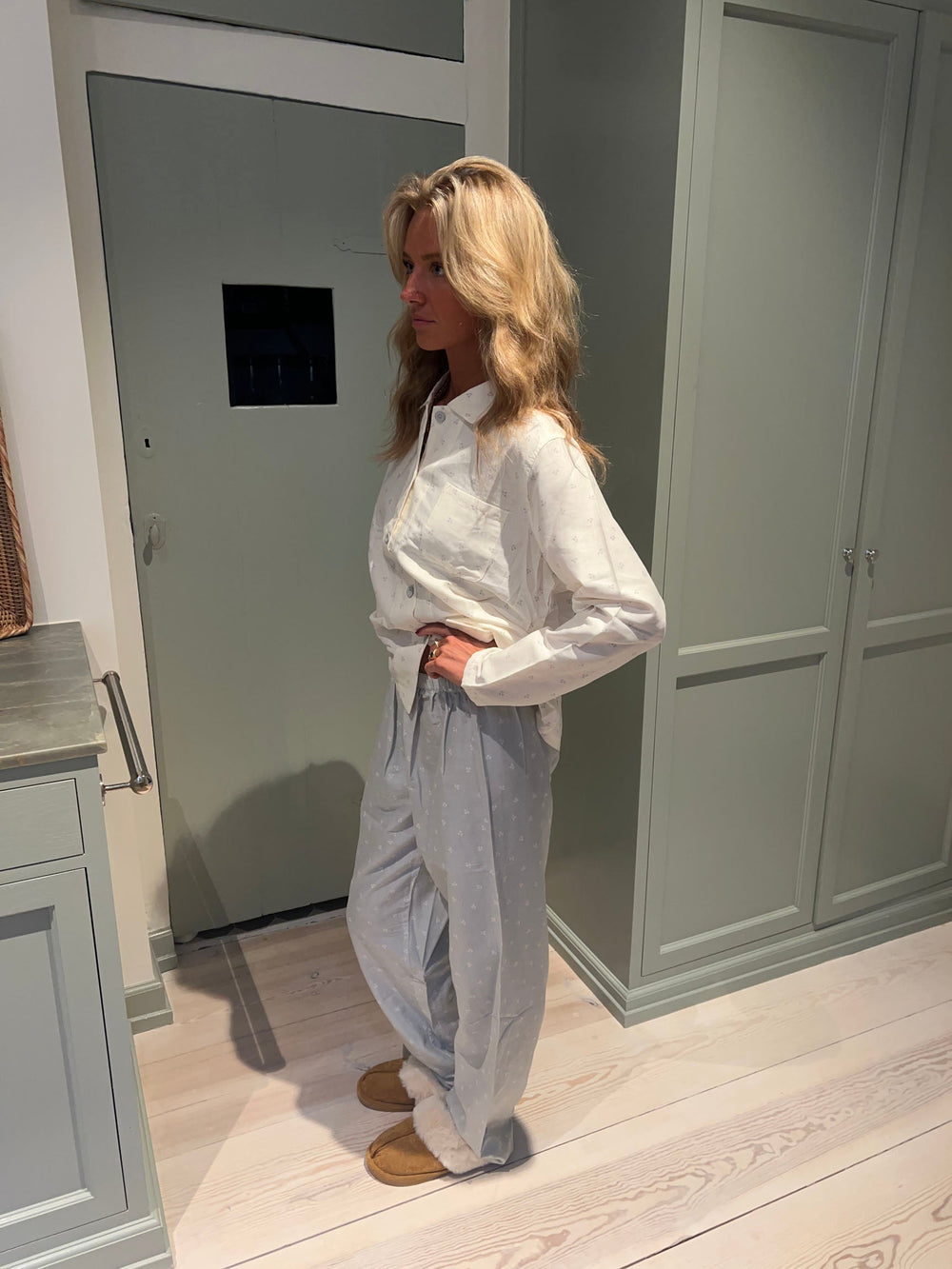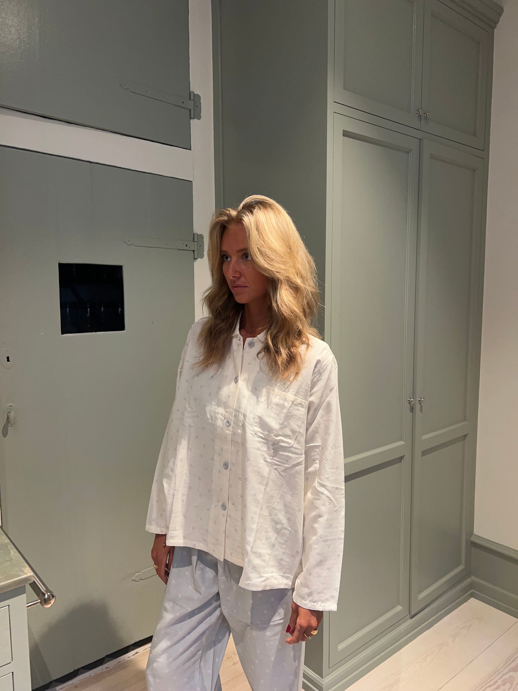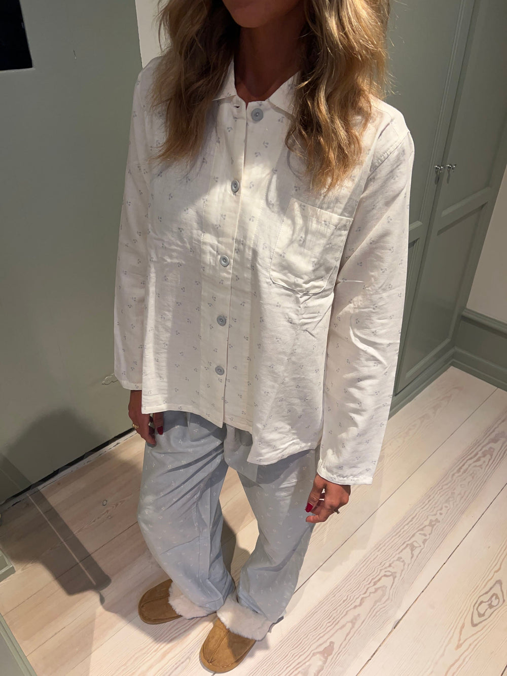 This pyjamas set in white and blue is both cute and comfortable, making it perfect for the colder seasons. It comes in white and blue with small cute details that add a playful and feminine touch. With its loose fit and super-soft fabric, it feels amazing against the skin.