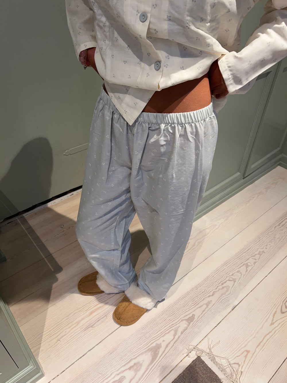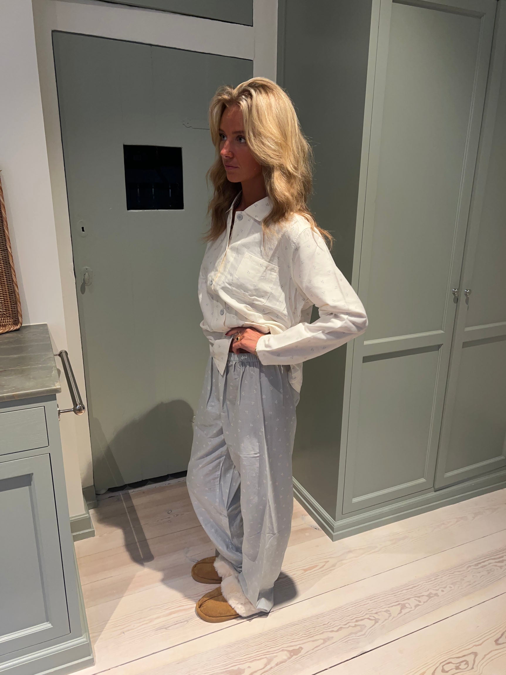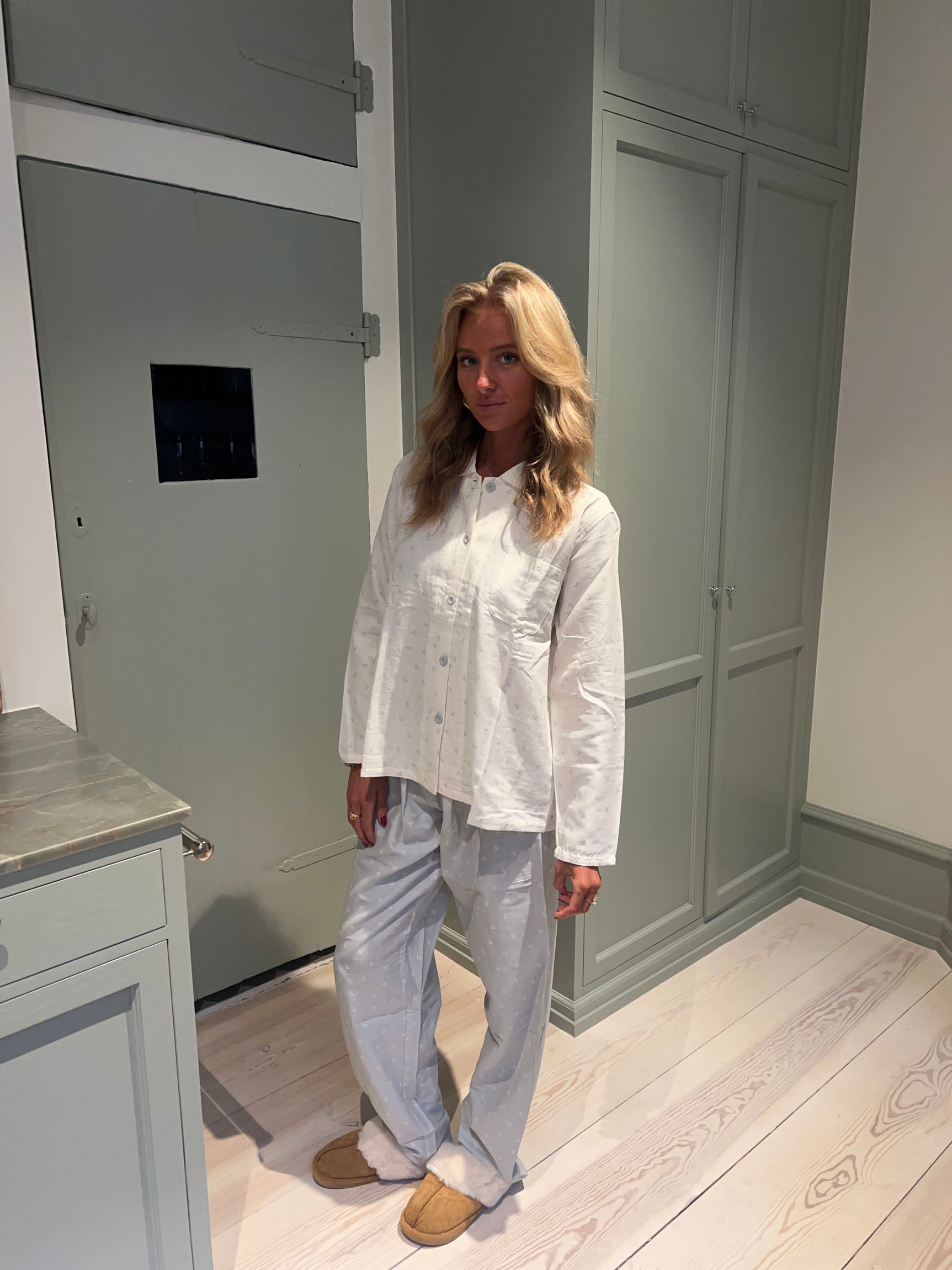 This pyjamas set in white and blue is both cute and comfortable, making it perfect for the colder seasons. It comes in white and blue with small cute details that add a playful and feminine touch. With its loose fit and super-soft fabric, it feels amazing against the skin.