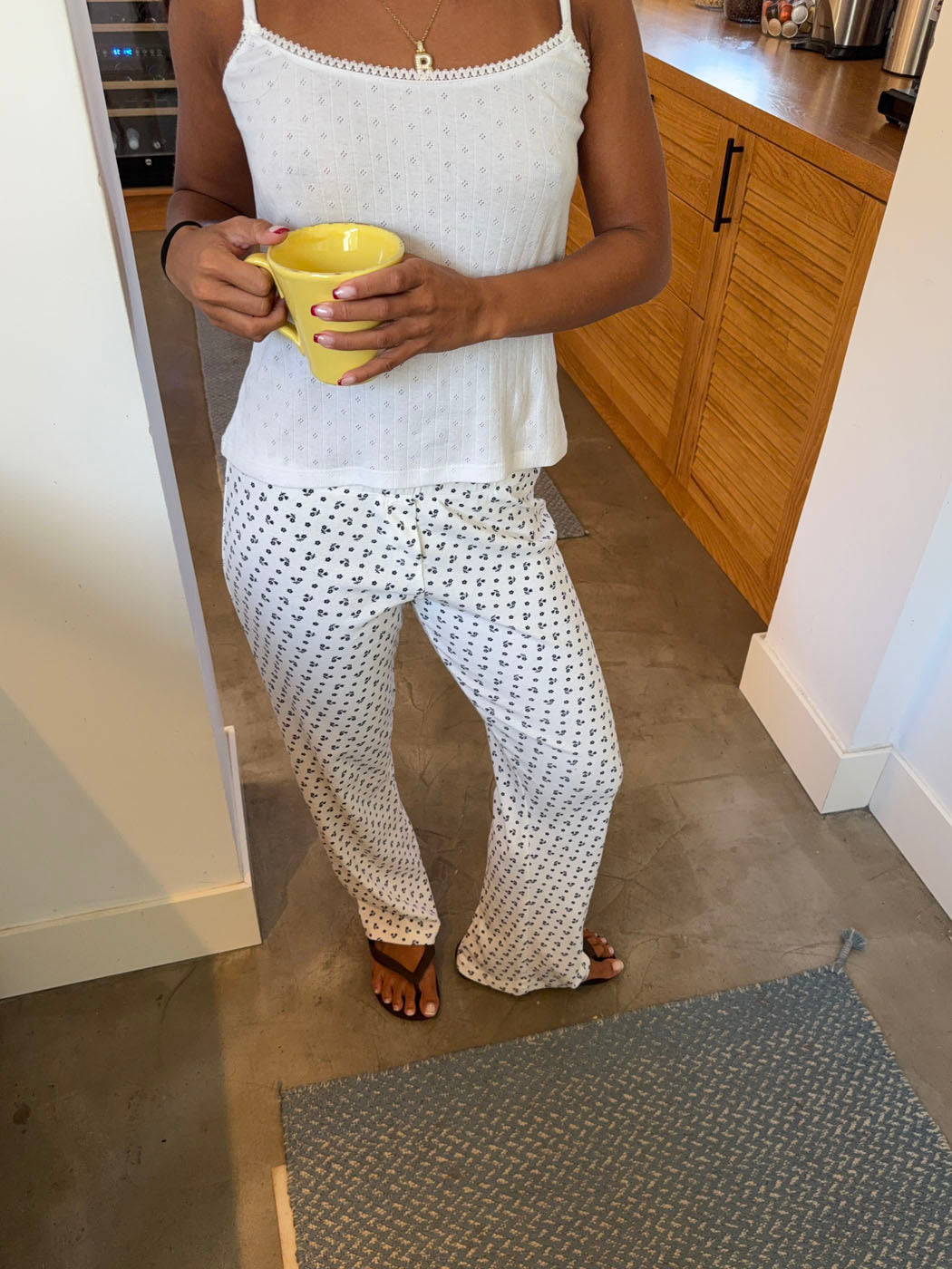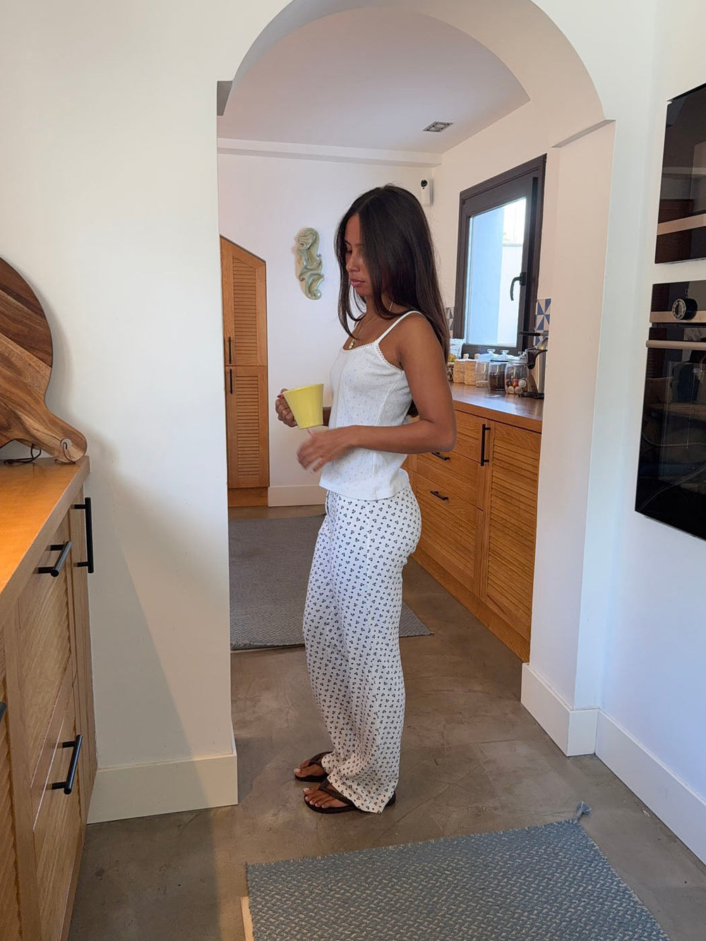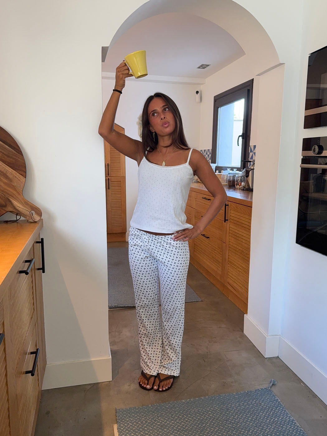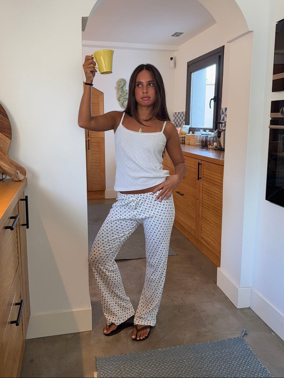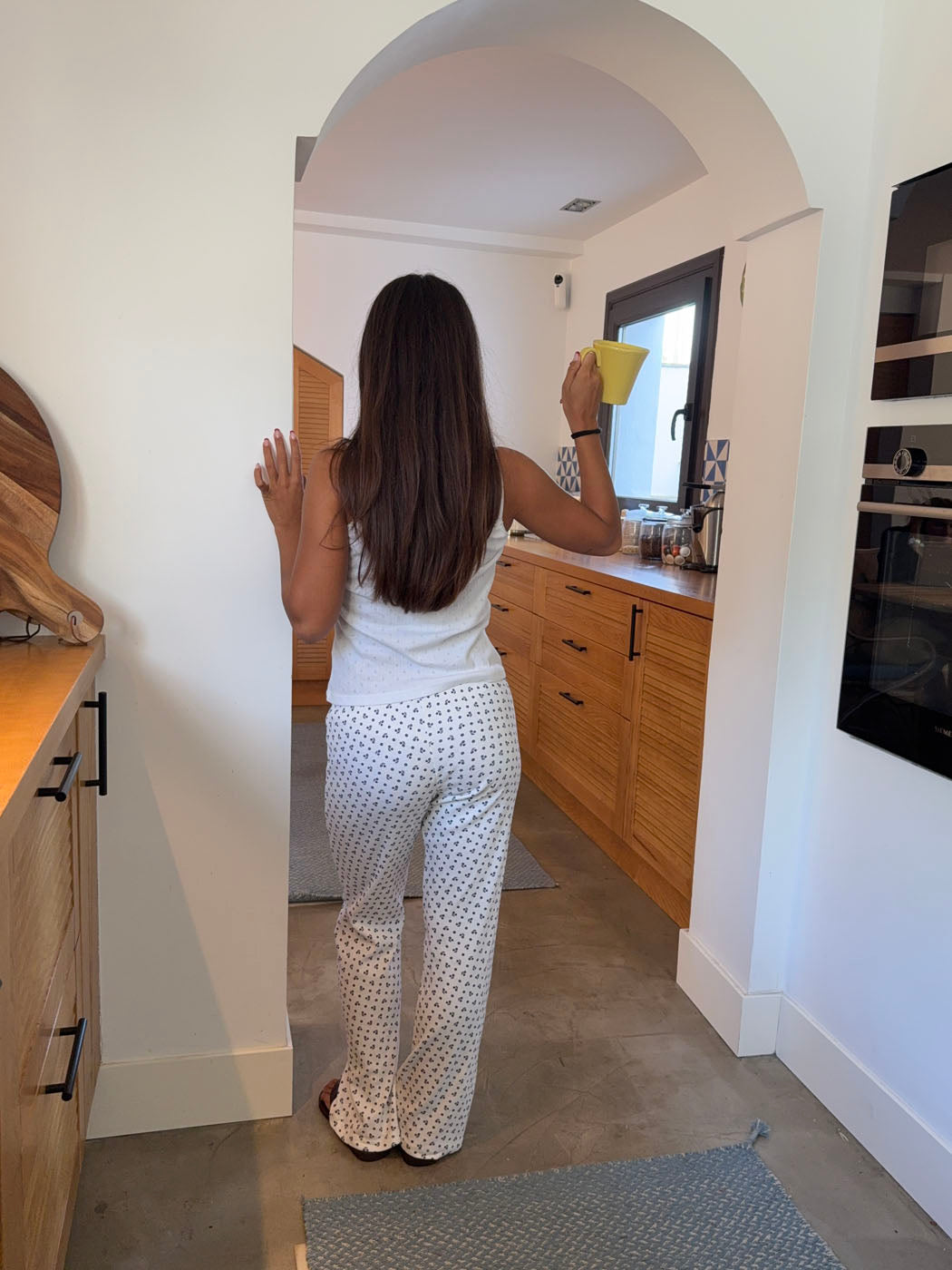 These white trousers with small dark blue flowers combine a romantic print with a relaxed fit. The soft fabric and elastic waistband ensure great comfort, while the delicate pattern adds a light and feminine touch. Perfect for everyday wear or lounging at home, they’re a versatile and comfortable choice that brings a hint of summer and ease to your wardrobe.