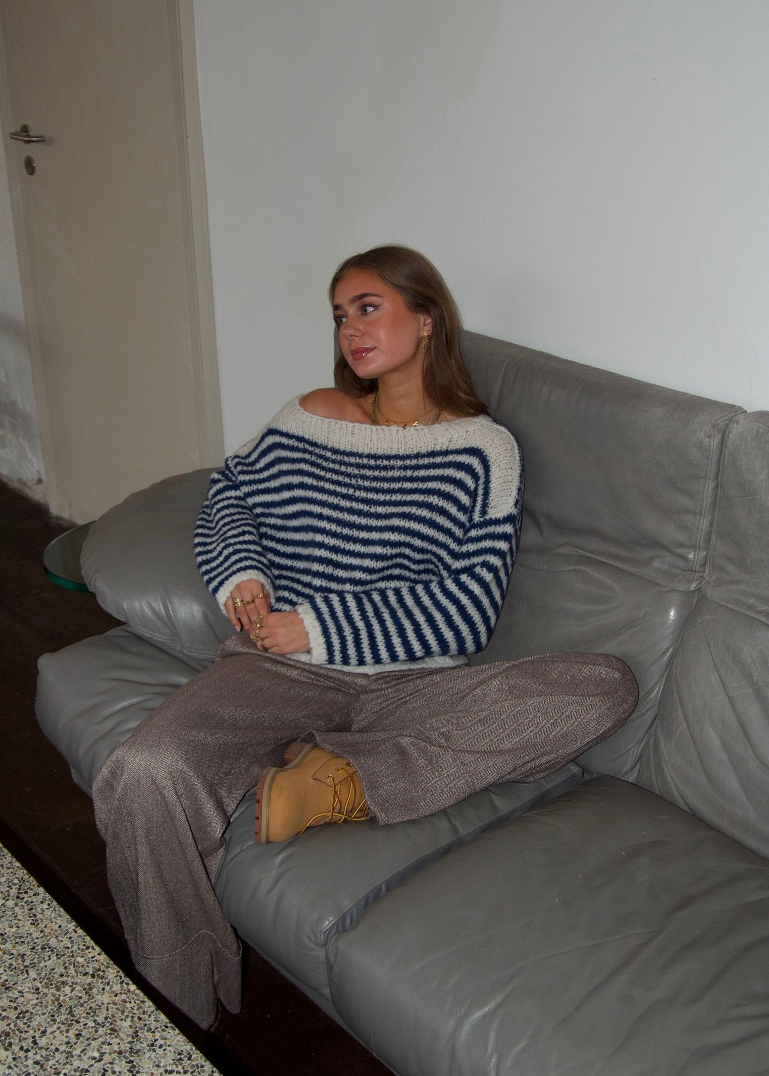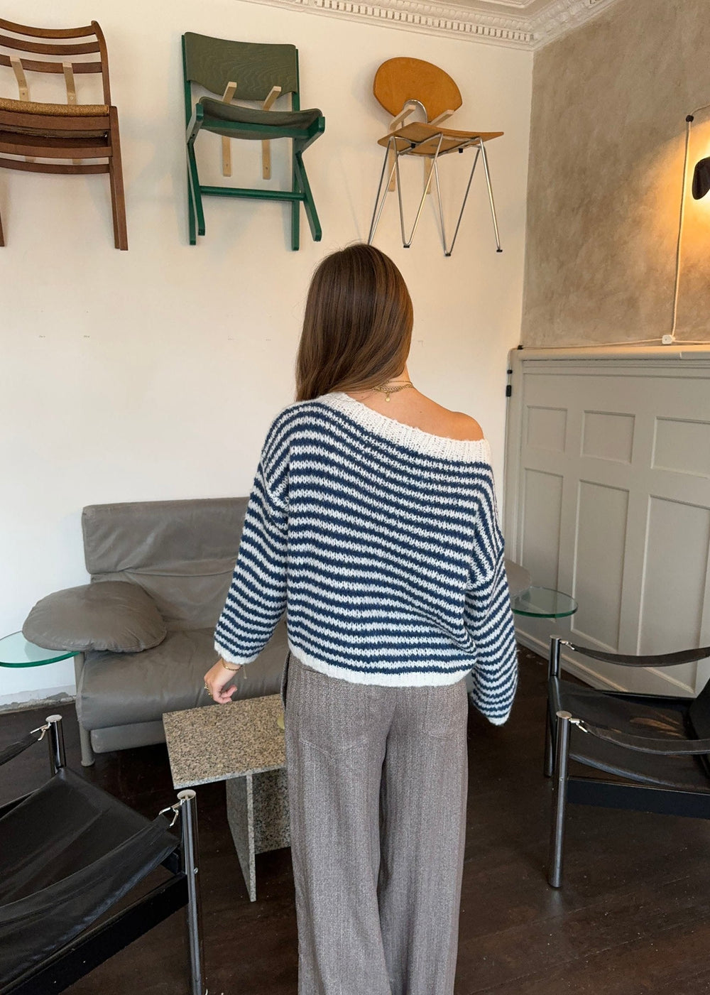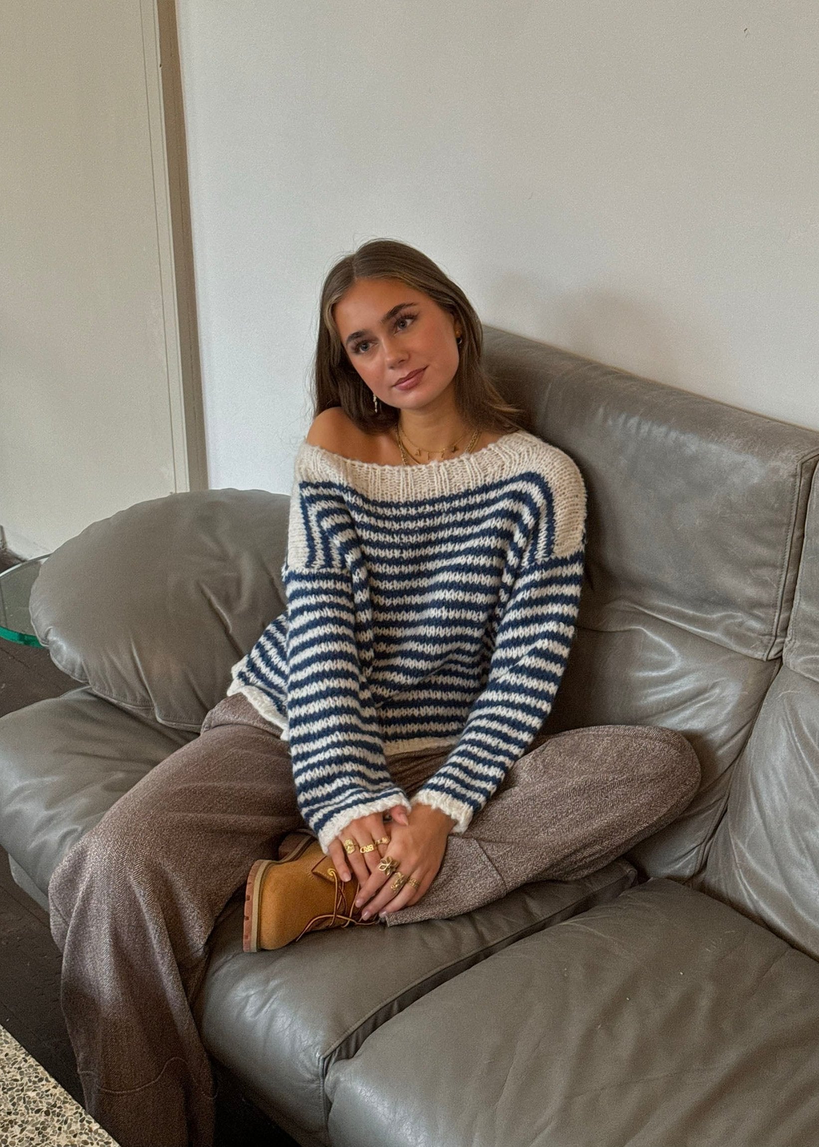 This sweater with navy stripes features a wide, loose fit that creates a relaxed and comfortable look. The sweater has a wide neckline that offers multiple styling options – wear it off the shoulder, one-shoulder, or simply as a wide neckline for a casual, modern expression. The long sleeves and soft knit fabric provide both warmth and style, making the sweater perfect for both laid-back and stylish looks.