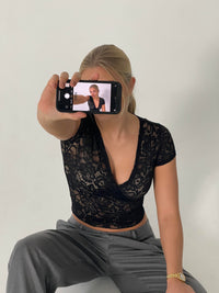 The finest close-fitting lace V t-shirt. In the pictures, it is styled with a neutral bra, and therefore it will be transparent if you don't have anything underneath.