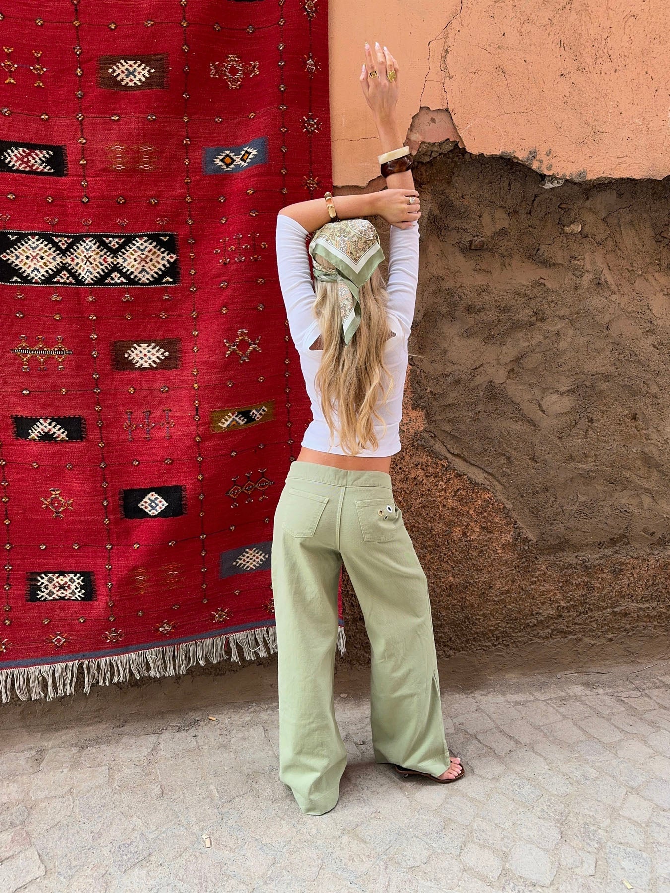 These jeans in a light green shade combine soft comfort with cool attitude. The wide fit falls straight from the hip down, creating a relaxed yet structured expression. At the waist, the simple cut is broken by striking metal rings all the way around – an edgy detail that adds character and contrast to the trousers. The sturdy cotton fabric has a light texture and a dusty finish that gives a rustic yet modern feel. Style them with a fitted top or a loose shirt for a balanced look. A pair of trousers for you who want to combine raw elegance with everyday comfort.