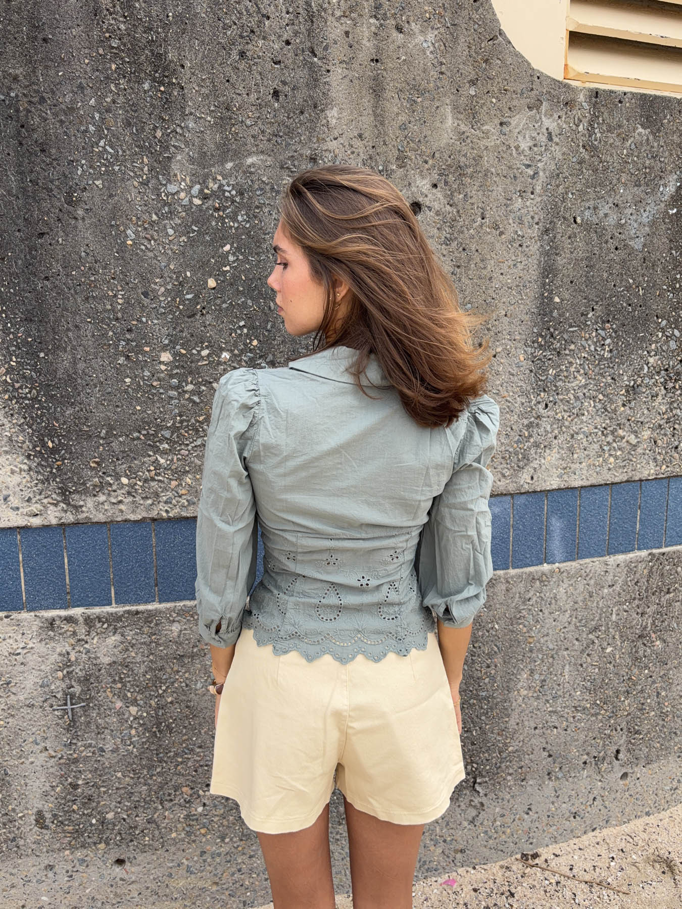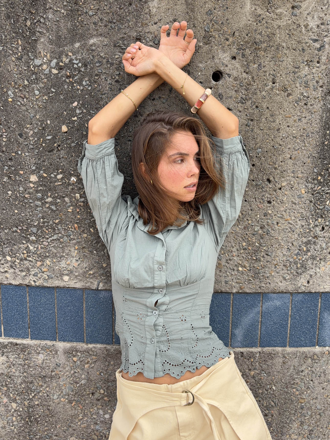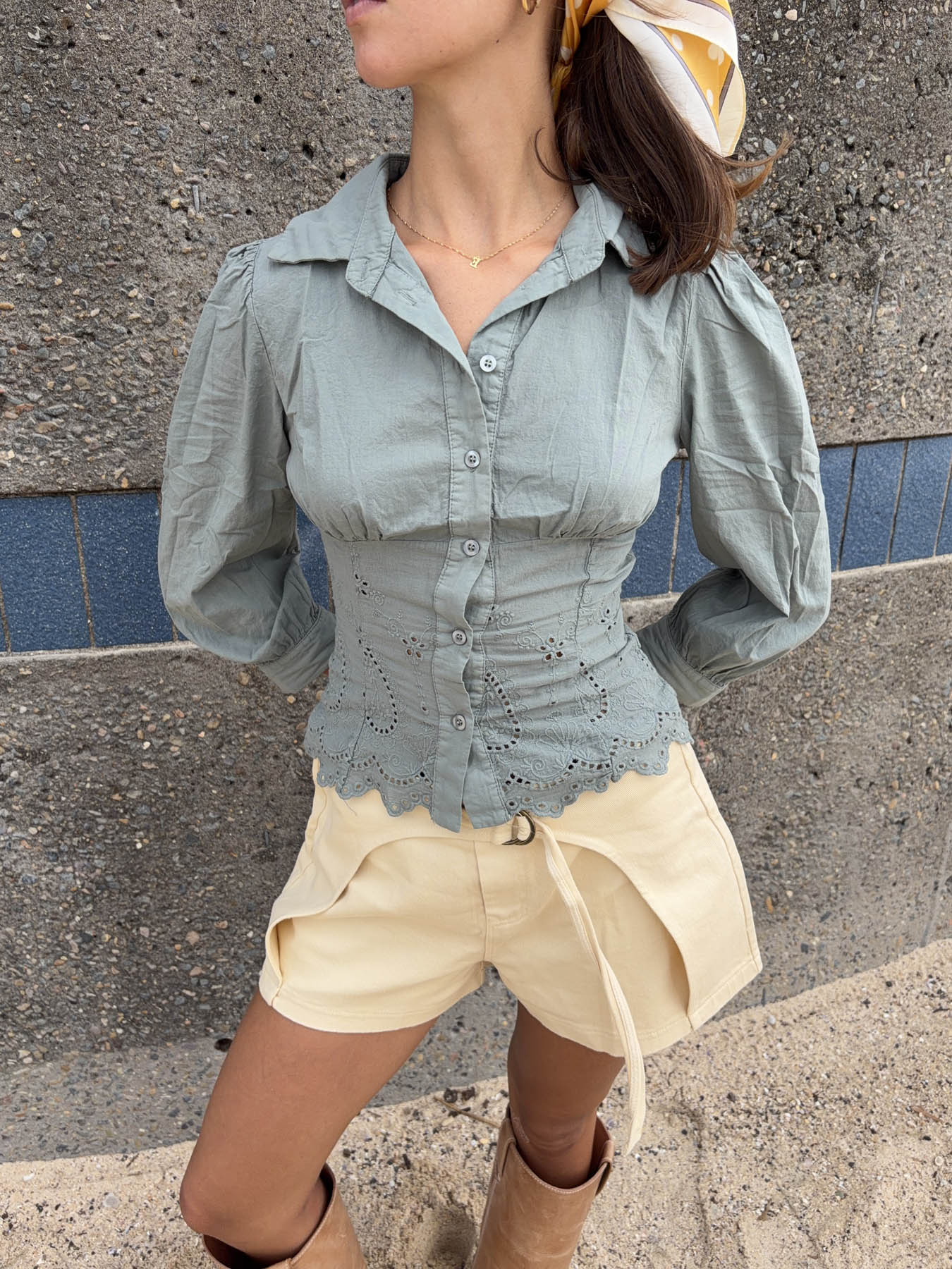 This tailored shirt in a classic khaki color combines elegance with a modern twist. The embroidered details add a sophisticated touch, while the long sleeves and puff effect at the shoulders enhance a flattering, feminine silhouette. Made from a light and comfortable material, it’s ideal for both everyday wear and more formal occasions.