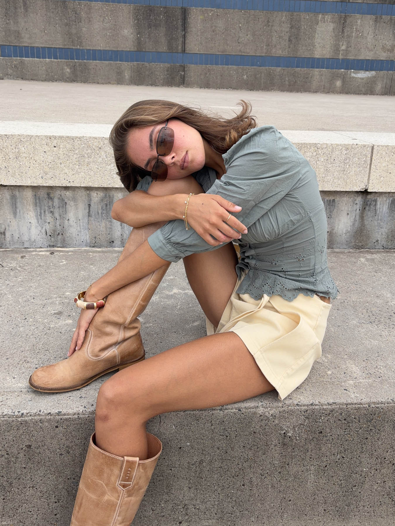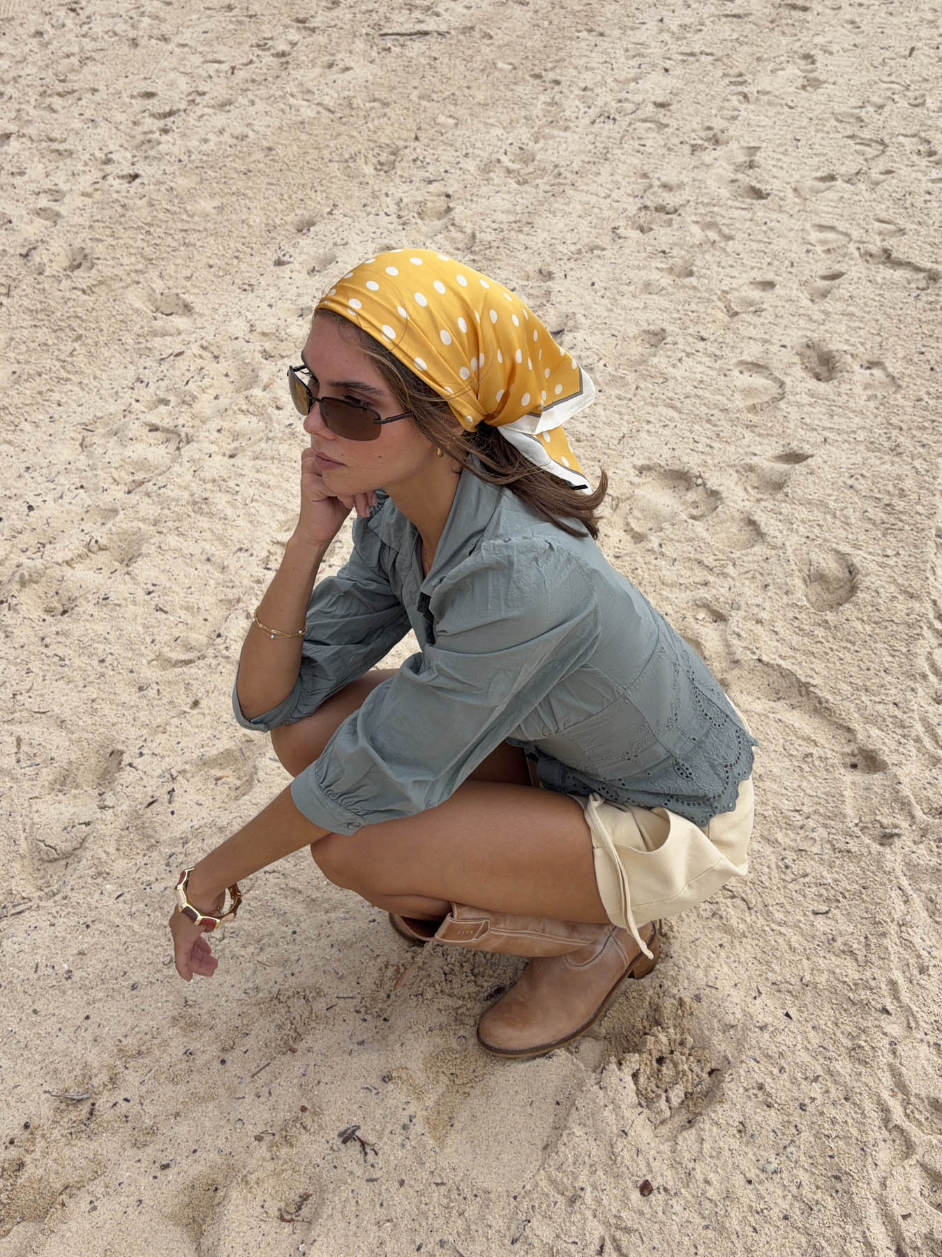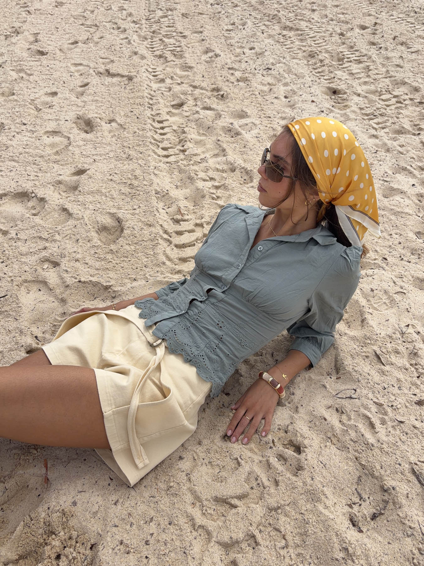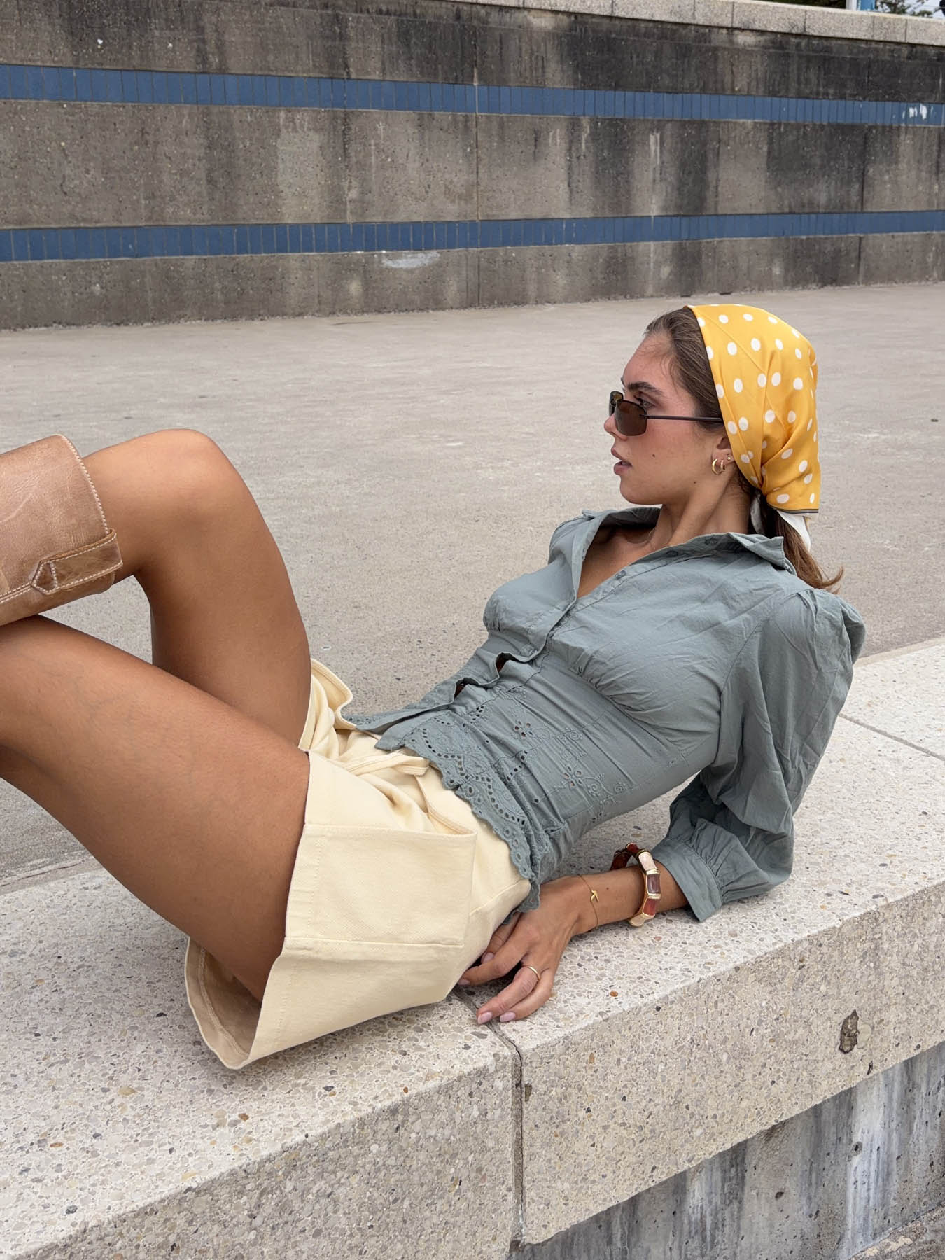 This tailored shirt in a classic khaki color combines elegance with a modern twist. The embroidered details add a sophisticated touch, while the long sleeves and puff effect at the shoulders enhance a flattering, feminine silhouette. Made from a light and comfortable material, it’s ideal for both everyday wear and more formal occasions.